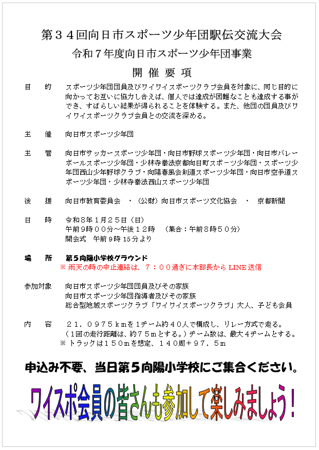 参加対象: 向日市スポーツ少年団団員およびその家族